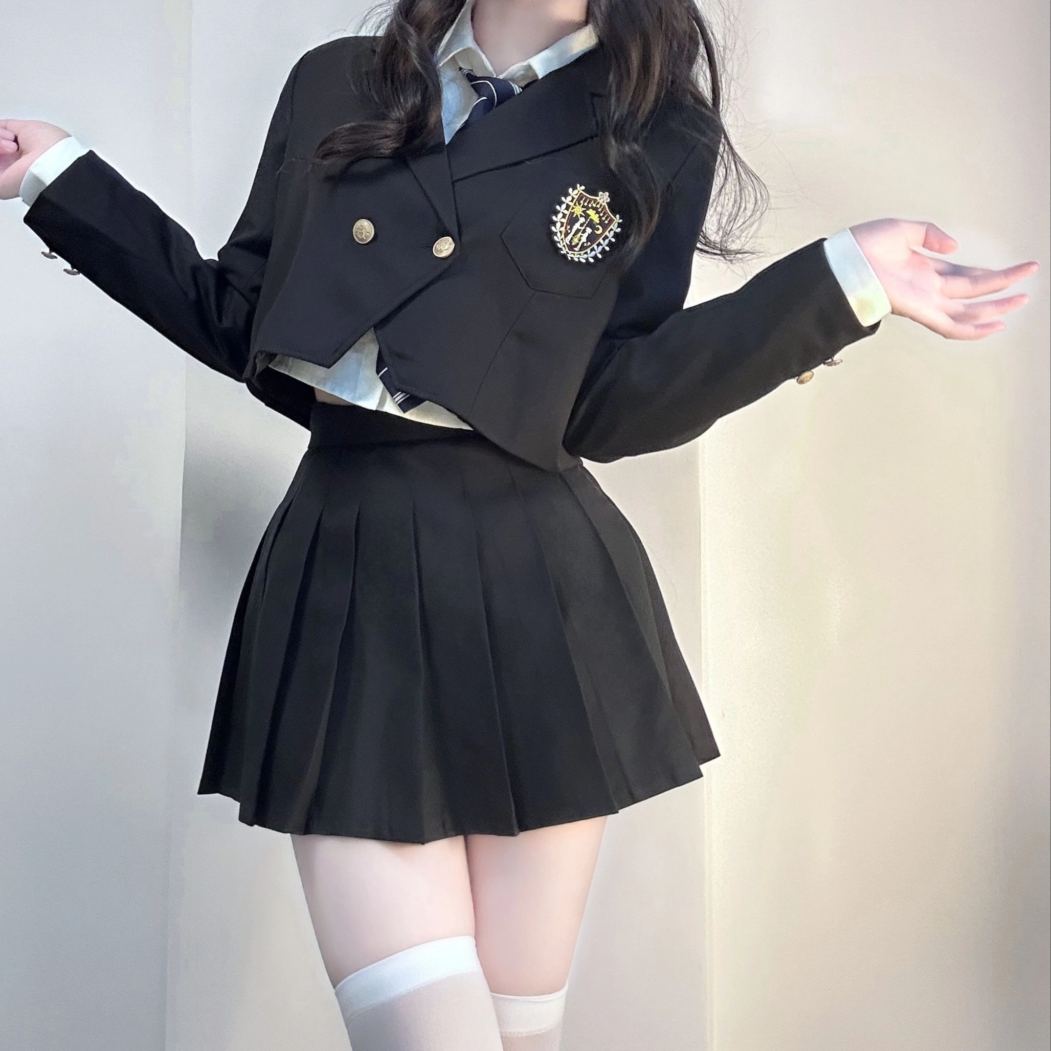 九条喵 徽章刺绣短款西装外套长袖衬衫纯色百褶短裙制服 女款